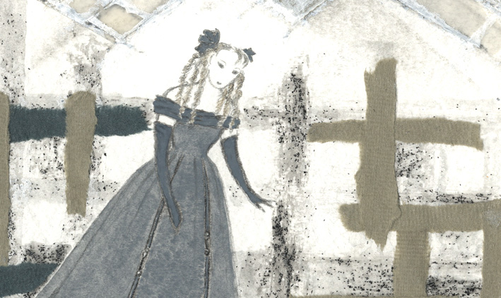 Unweit vom Zaun, inmitten unbenutzter Stühle, entdeckte Sophie die weiße Gestalt, deren Gesicht mit feinem Tüll verhängt war.