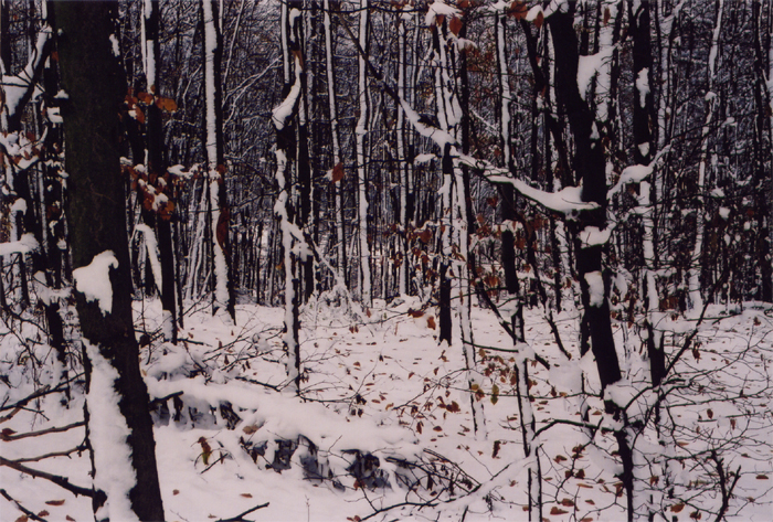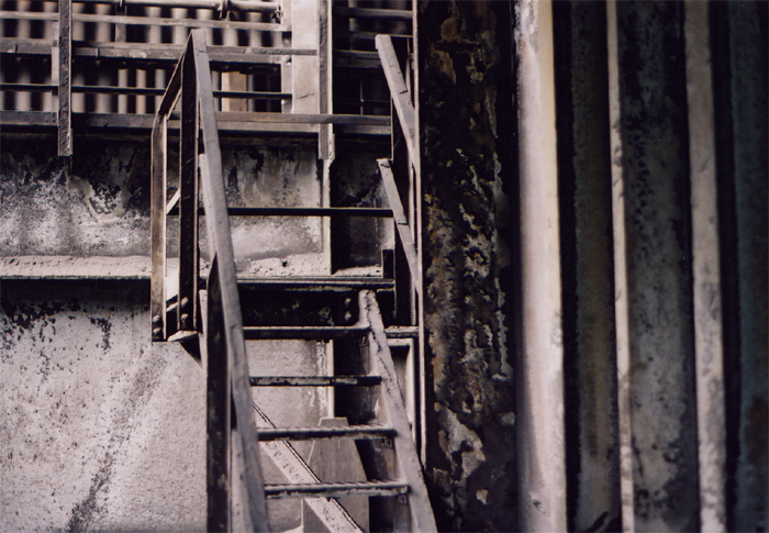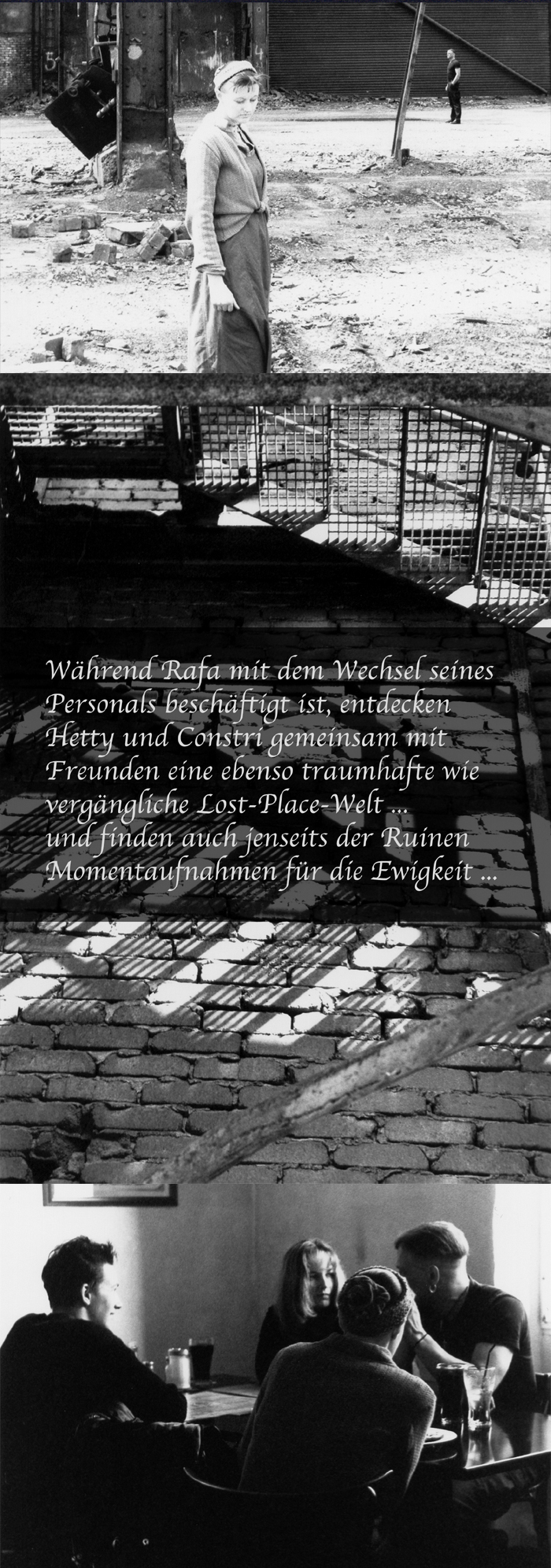 Über das steile Treppenhaus aus Gitterrosten kommt man auf einen Balkon, früher unterm Hallendach, jetzt nach dem Teilabriß im Freien. Von diesem Balkon aus verstreute ich Federn aus einem alten Kopfkissen. Sie rieselten wie Schneeflocken in die staubgrauen Abgründe der Schlucht zwischen Stahlpfeilern und stahlgestützten Mauern. Constri stellte sich in dieses "Schneetreiben" und ließ sich filmen und fotografieren. Die märchenhafte "Frau Holle"-Szene erzeugte eine ähnlich unwirkliche und melancholische Atmosphäre wie die Wiegenlieder an den Abbruchmauern.